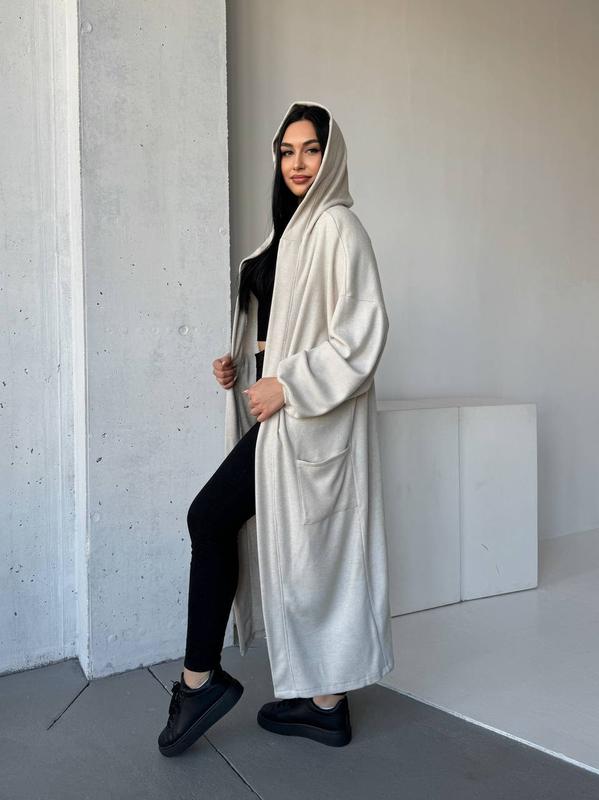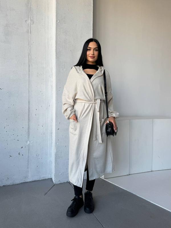 - есть накладные карманы, капюшон и поясок.