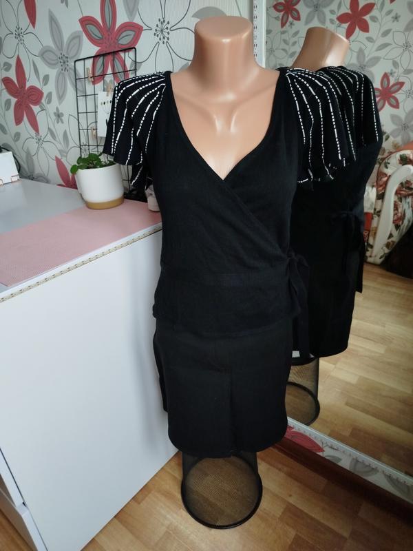 Кофта накидка на запах блузка на короткий рукав черная удлиненная кардиган на завязки s m