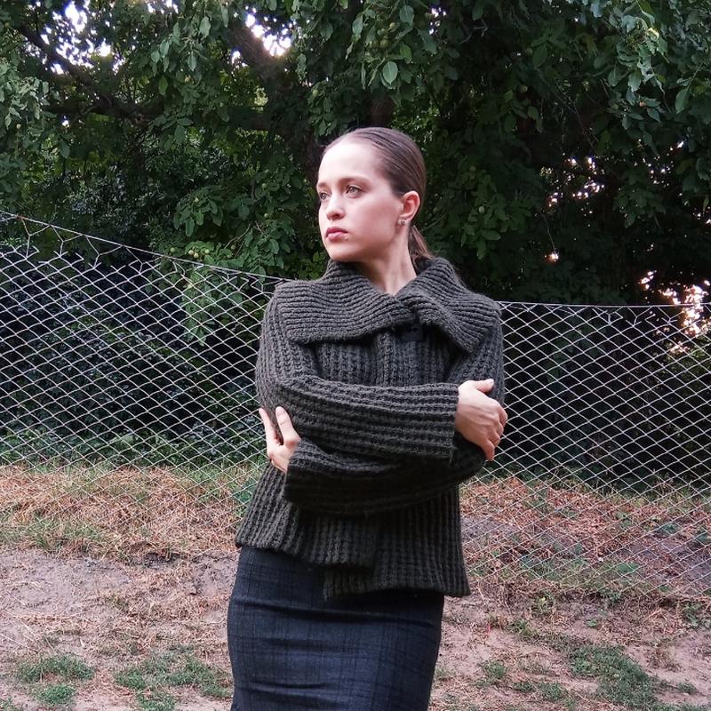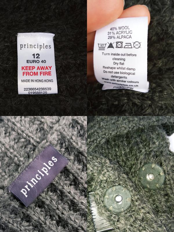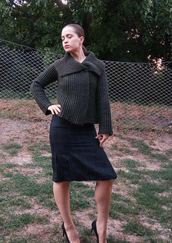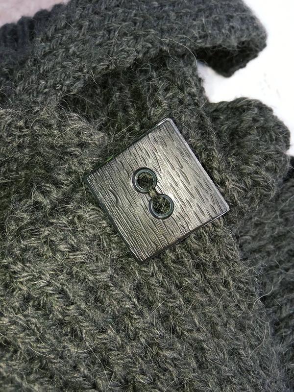 Мягкая и совершенно не колючая. Застёгивается на одну большую пуговицу кнопку. Цвет болотный, бутылочный зелёный.