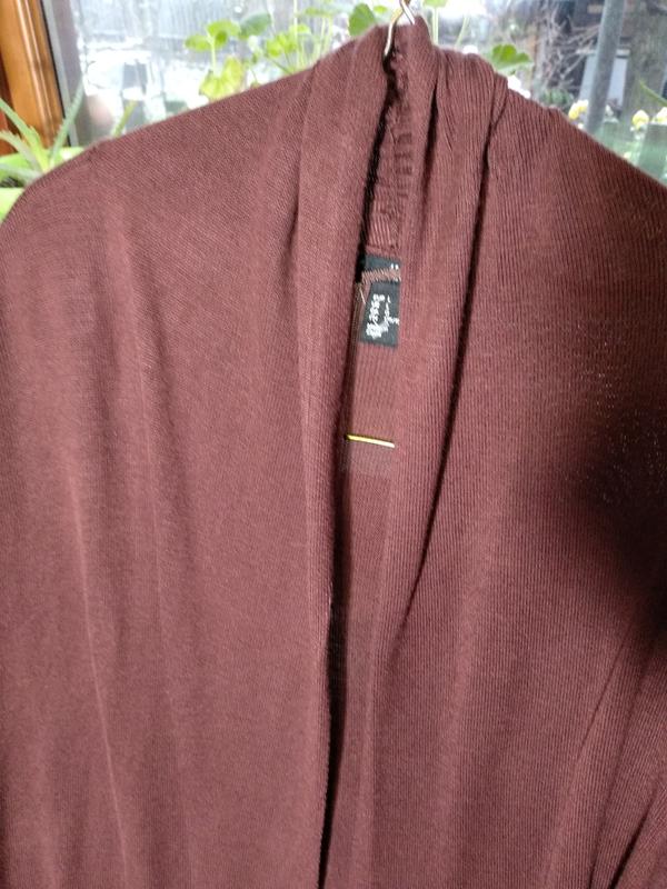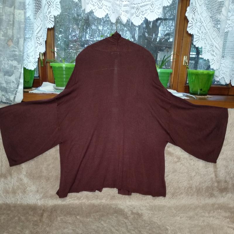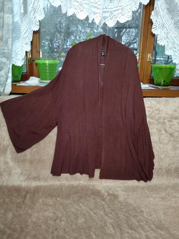 Кардиган без застежки оверсайз, удлиненная линия плеча. Новый, без бирки. Пластичная ткань, 100% вискоза. Замеры: длина от плеча 65 см., полуобхват груди 53 см (не учитывая хлест), длина рукава 29 см.