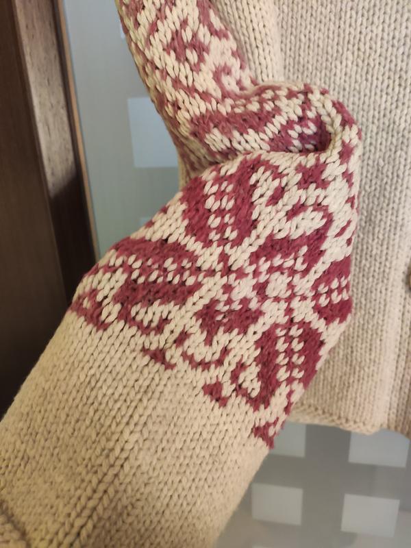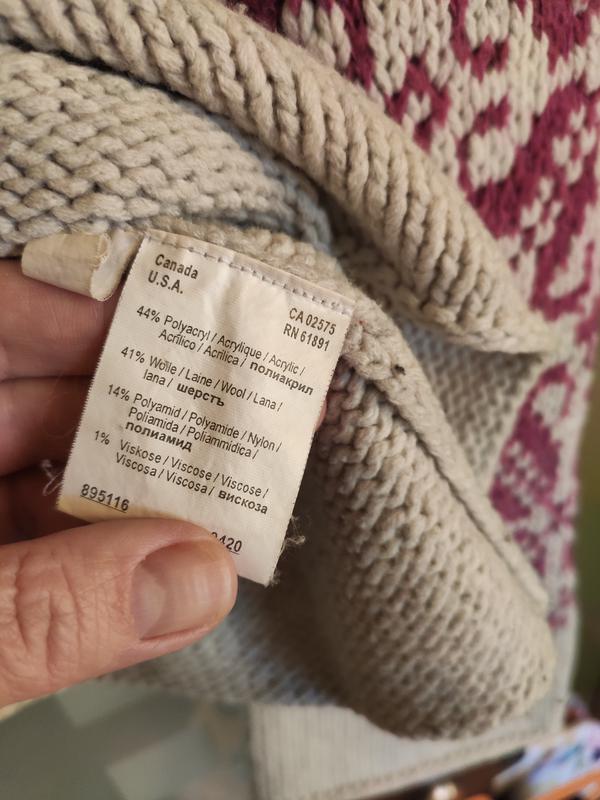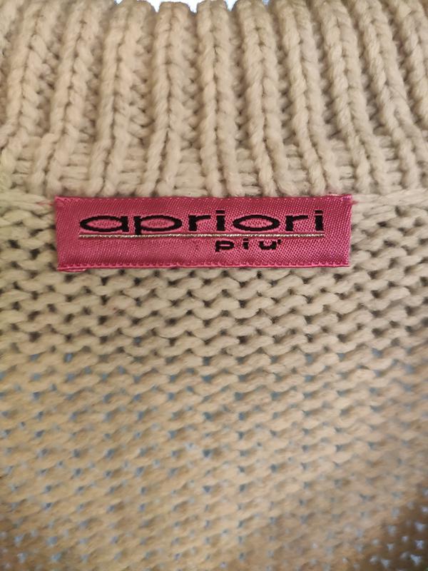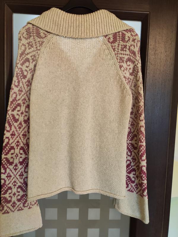 Тёплая и уютная кофта немецкого бренда Apriori. Отличное качество. Рукав реглан, расширяется к низу и украшен орнаментом градиентного цвета. Хороший состав (см.на фото), почти не кашлатится.