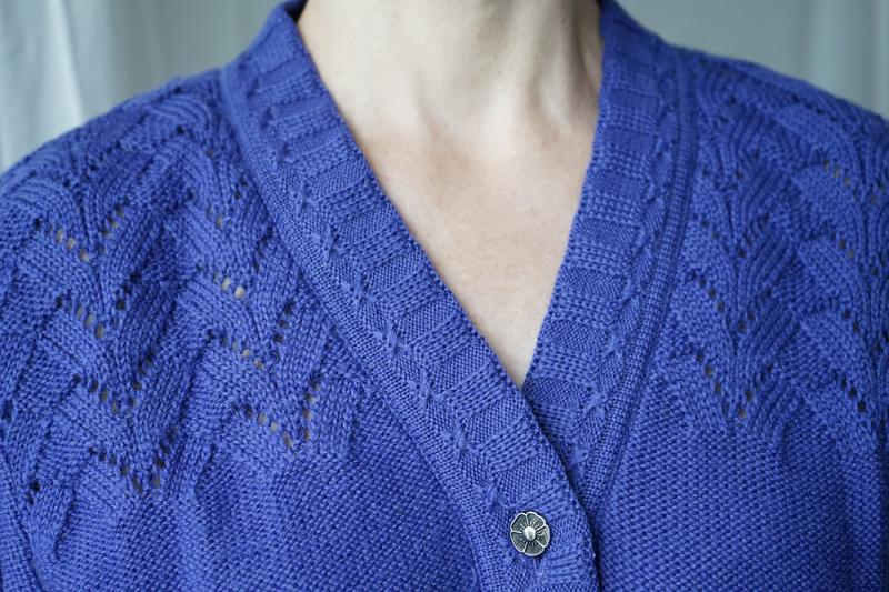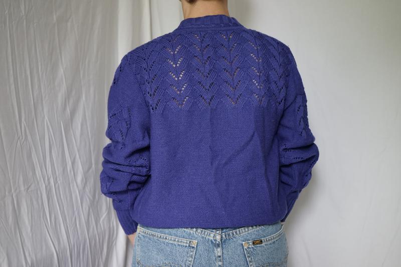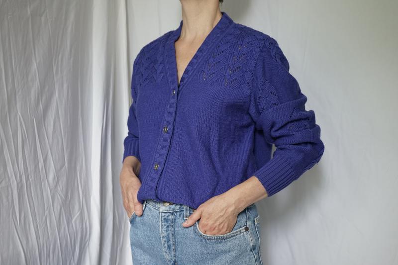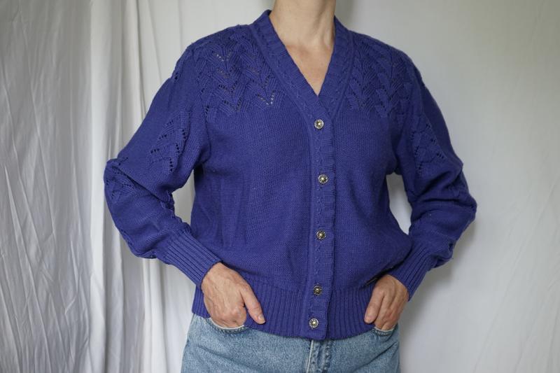 Очаровательный винтажный кардиган от известного австрийского бренда. Красивая вязка с элементами ажурной вязки, V – образный вырез, интересные пуговицы в виде цветочка, приятный на ощупь и в носке. Шерсть, но не колючая. Цвет сине-фиолетовый.