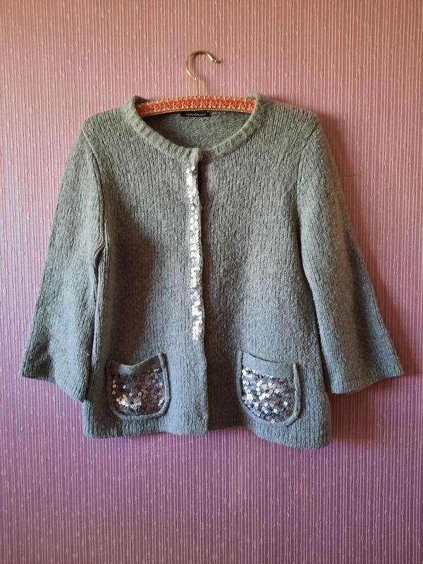 дизайнерская красивая теплая кофта от Luisa Cerano,плечи 41см длина 59 см,рукав 45 см(рукав 3/4),Пог 48 см,пот 44 см,тянется,декор из паеток,застегивается на кнопки(а кнопки обшиты атласом.)