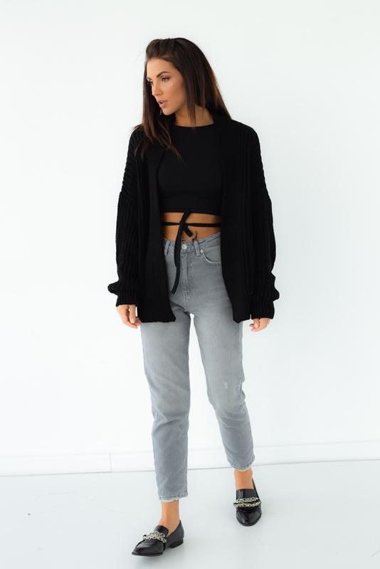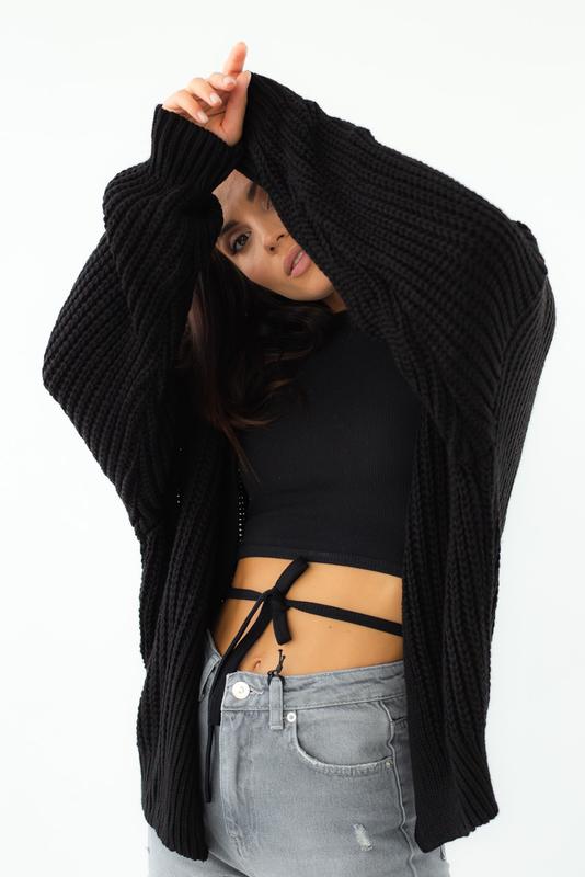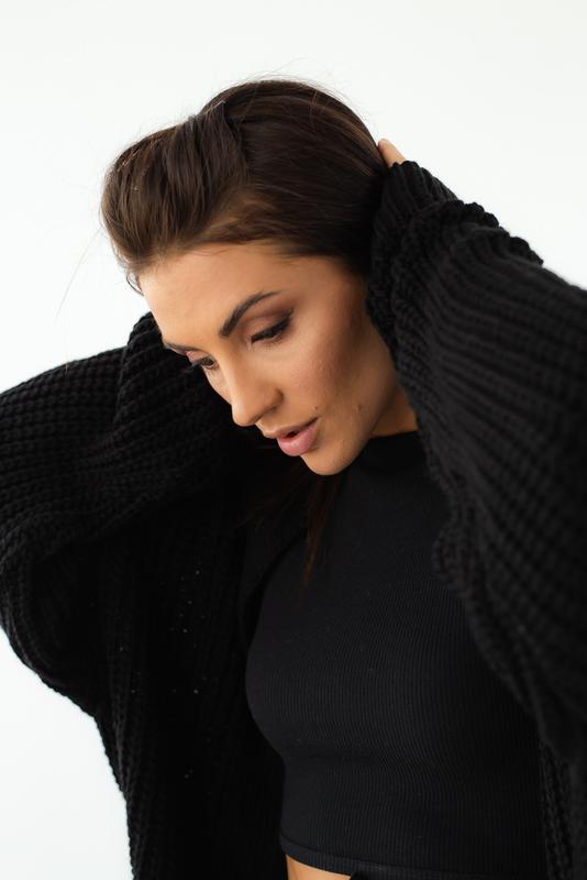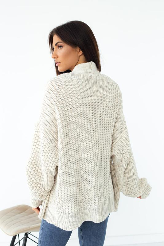 Длинные рукава имеют свободный крой и завершаются манжетами-резинками на запястьях. Приятная и мягкая ткань порадует комфортом во время носки. По низу кардиган декорирован вязкой резинка, имеет классический прямой силуэт.