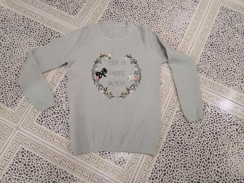 Очень красивый, нежный женский свитерок, свит шот мятного оттенка с вышивкой и аппликацией. В идеальном состоянии, как новый, одевался один раз, никаких следов носки и дефектов нет! Очень мягенький и приятный к телу! Тянется. Замеры: Рукав-54 см ПОГ-43 см ( от подмышки к подмышке) ПОТ-40 см Ширина низа-36 см Длина-58 см Плечи-30 ми