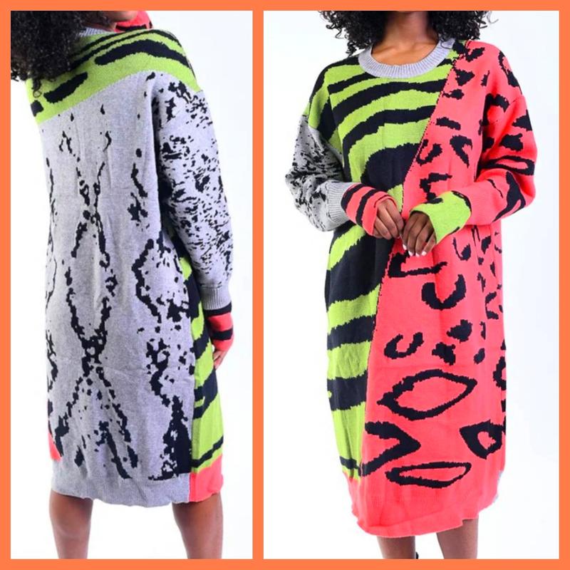 Вязаный леопардовый оверсайз-минер удлиненный свитер бежевый серый туника теплый трендовый стильный