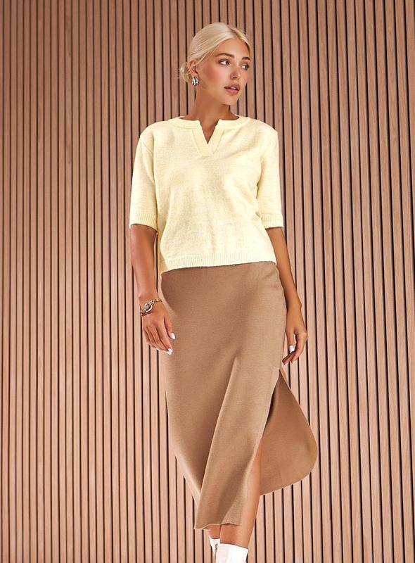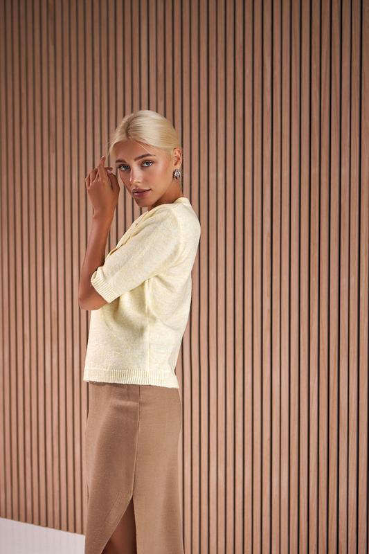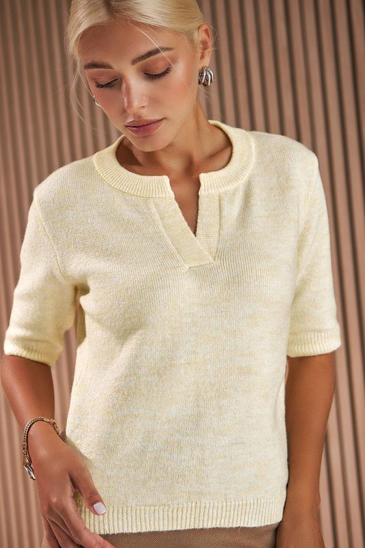 изделия. Джемпер приталенного силуэта имеет укороченный рукав и изящный вырез