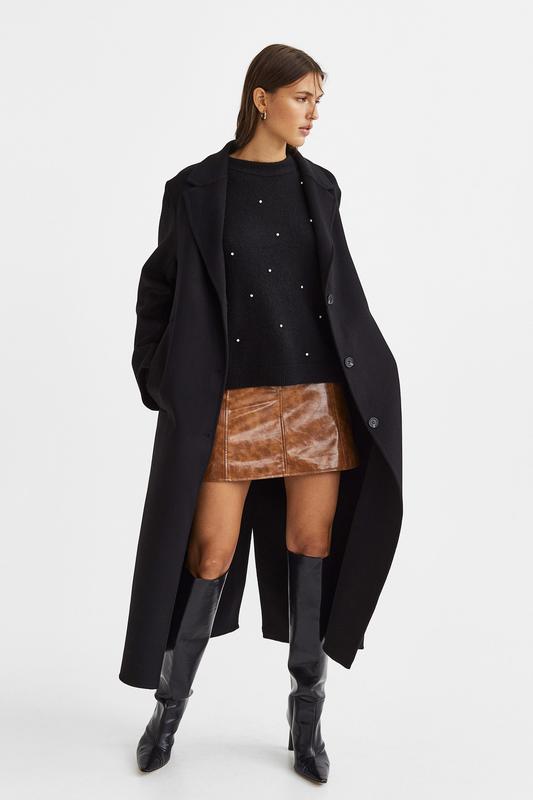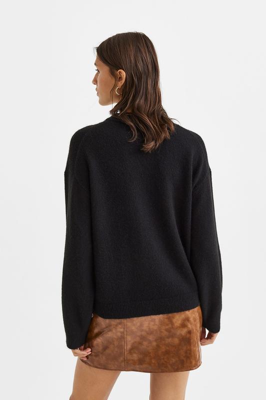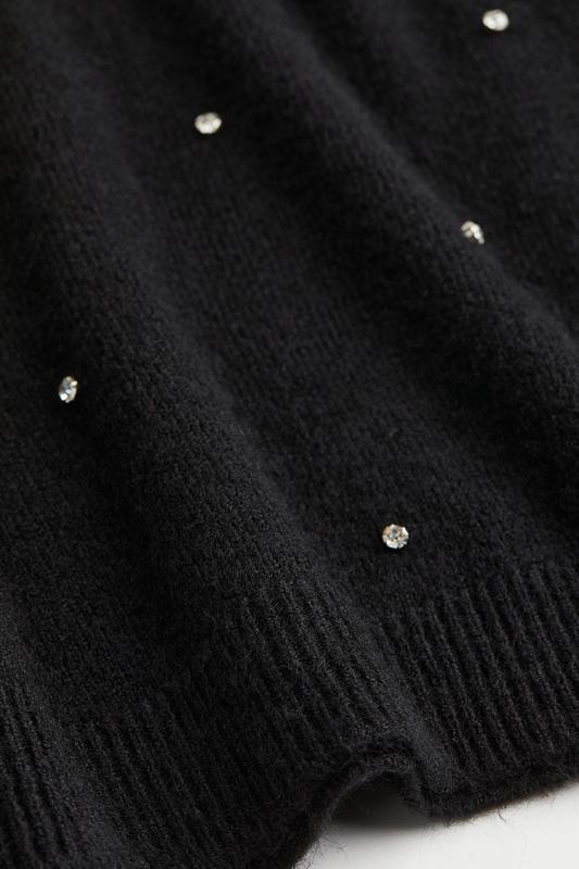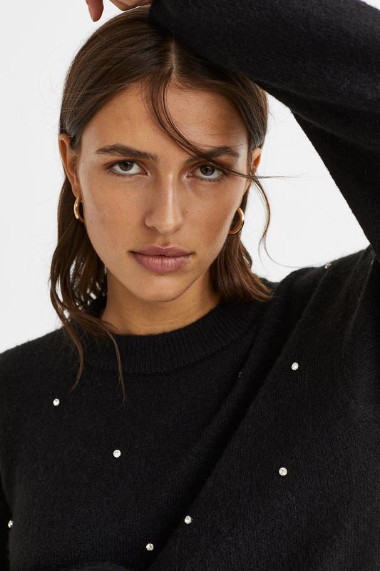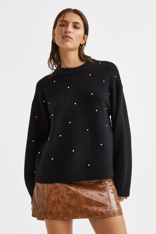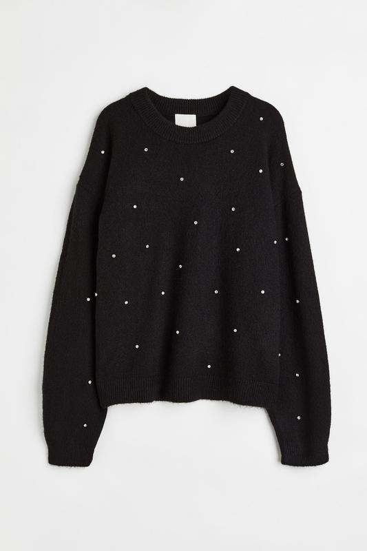 H&M Свитер женский черный из мягкой вязки с добавлением шерсти, круглым вырезом, заниженной линией плеч и длинными рукавами. Передняя часть с пришитыми пластиковыми бусинами и рельефной резинкой по горловине, манжетам и нижнему краю.