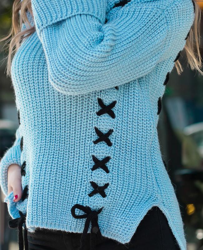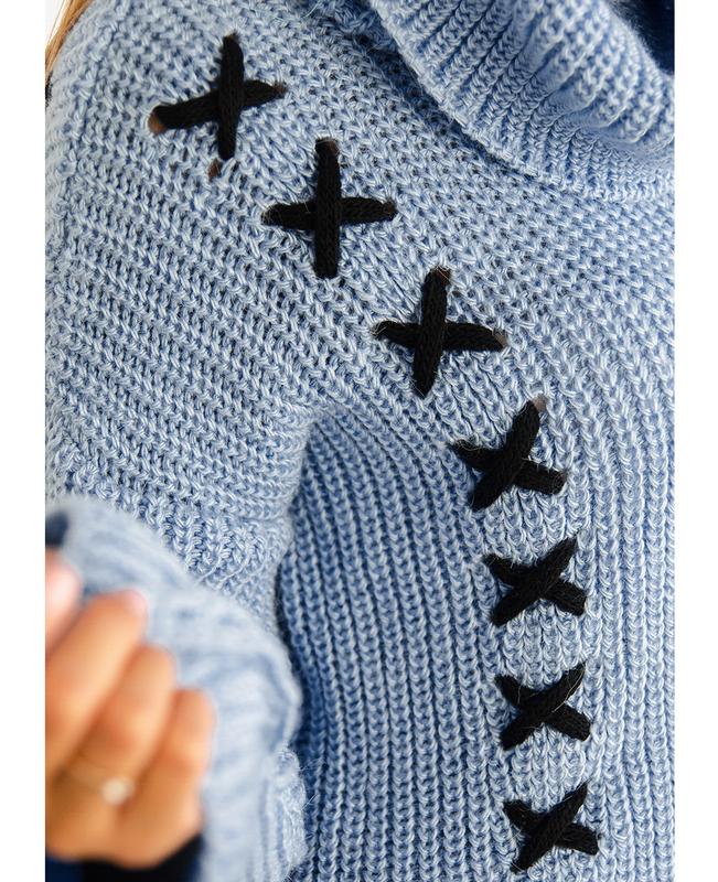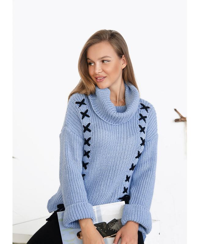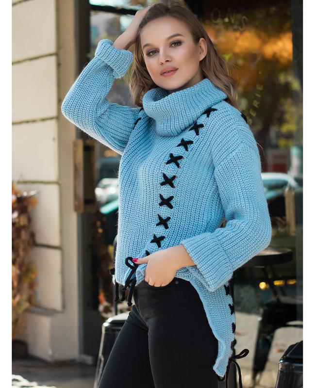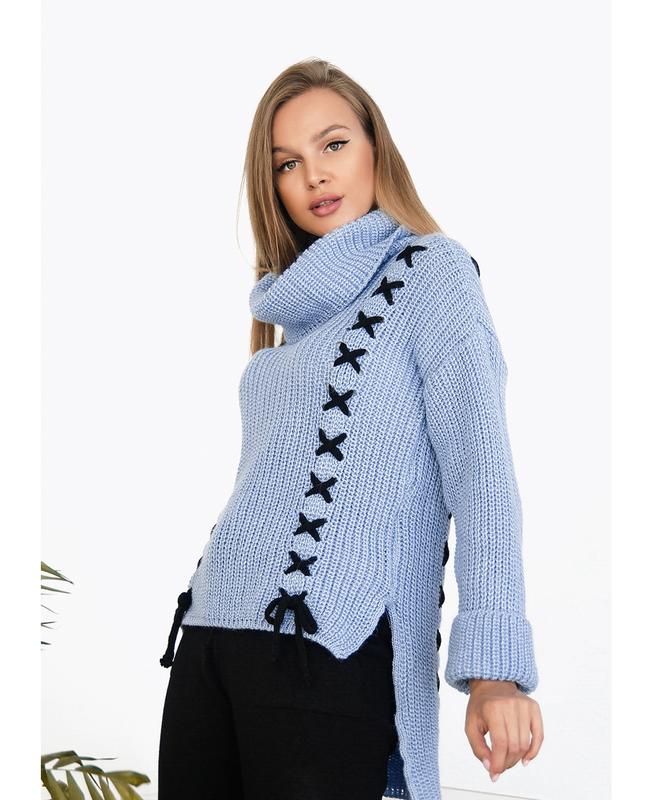 Вязаный свитер с контрастной шнуровкой и расклешенными рукавами-колоколами. Рукава подворачиваются в широкие манжеты. Широкий воротничок-гольф и удлиненный на спине подол с разрезами. Производство Турция.