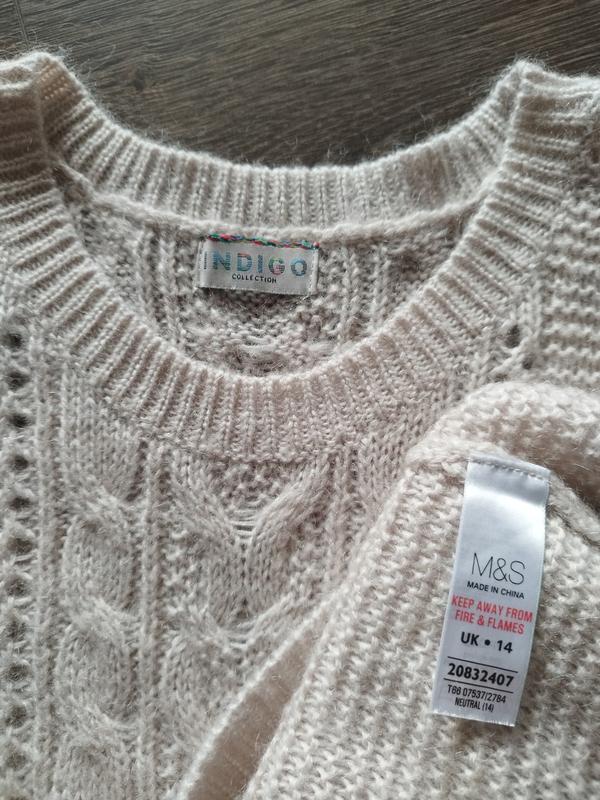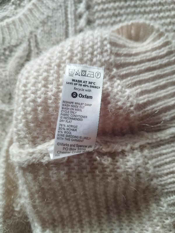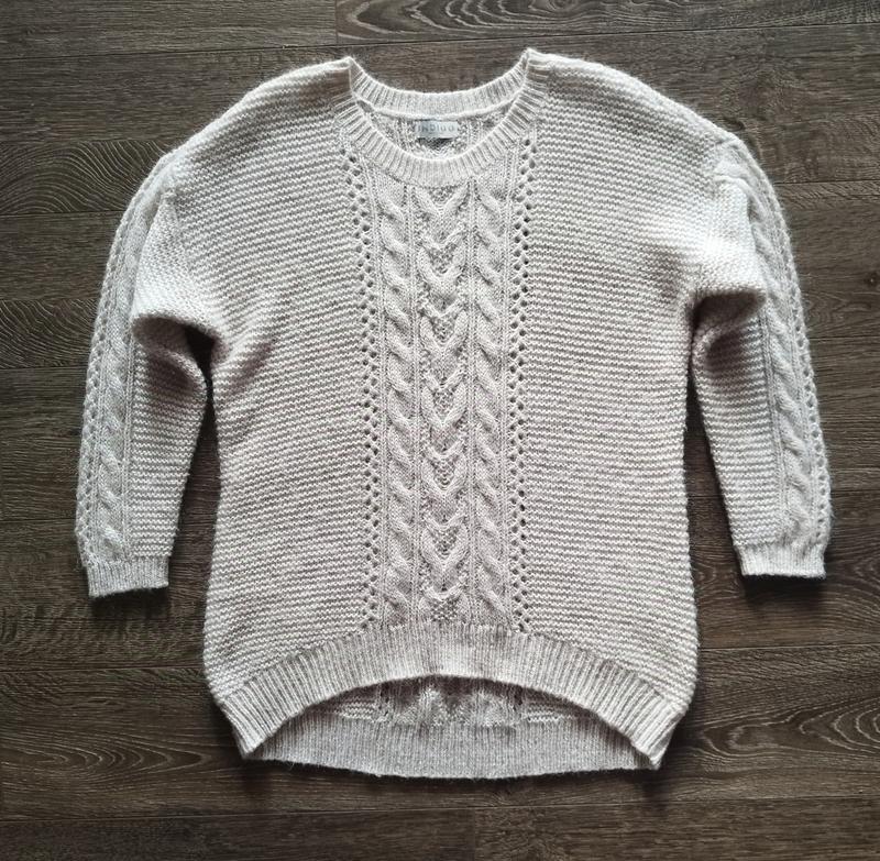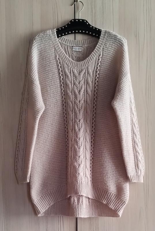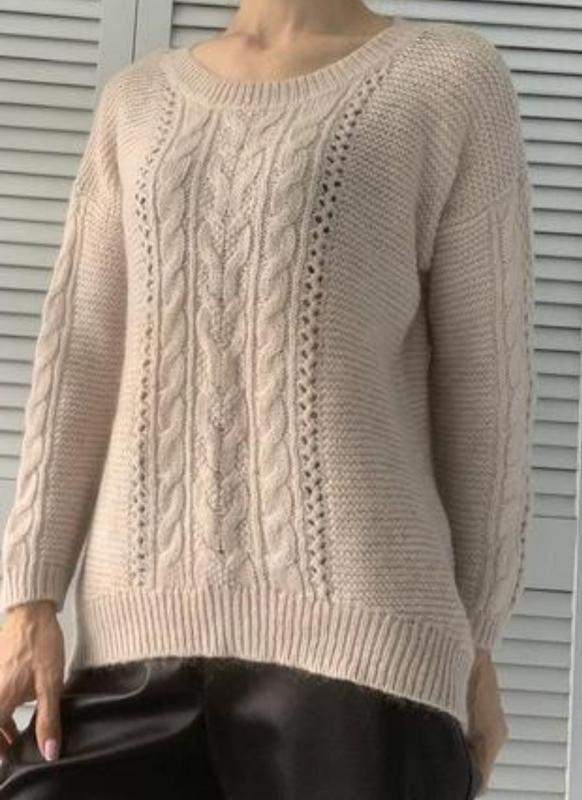 Свитер с "косами" пудрового натурального цвета с мохером и шерстью в составе.Круглый вырез, заниженная линия плеча и длинные рукава. Удлиненная спинка.