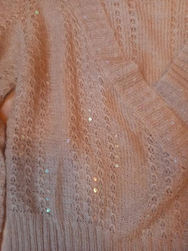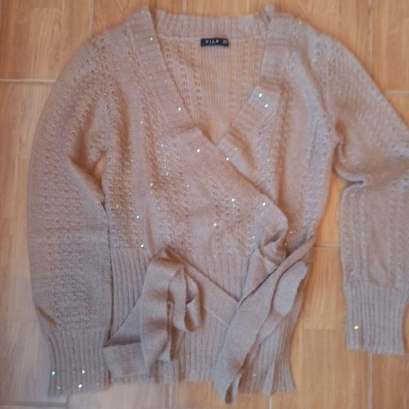 Vila тепла кофтаПесочного цвета.Вышитая пайетками.На запах.Размер xs.Состав: 85% полистирола, 15% мохер.