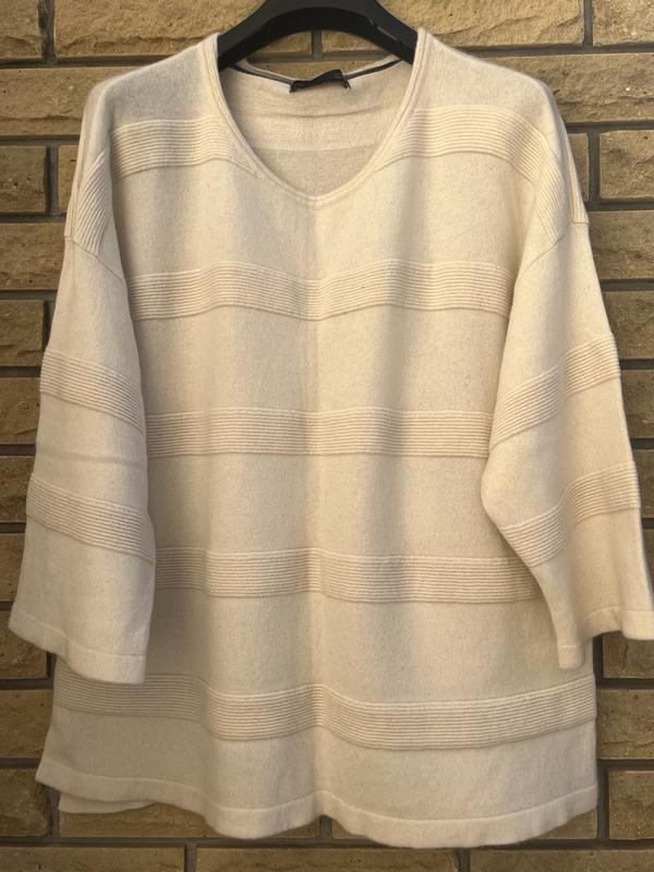 Отличный кашемировый свитер английского бренда Marks & Spencer Крой прямой, по бокам разрезы, рукав 3/4, отделан интересной вязкой, Качество кашемира отличное, Состав : 100% пюр кашемир (кашемир высокого качества) Цвет: белый - молочный Размер : ХЛ Состояние отличное. Замеры, длина спереди 65см. по спинке 67см. полуокружность в груди 60см. длина рукава от горловины 58см. Плечи не замерила, потому что крой с приспущенным плечом. Крой прямой.