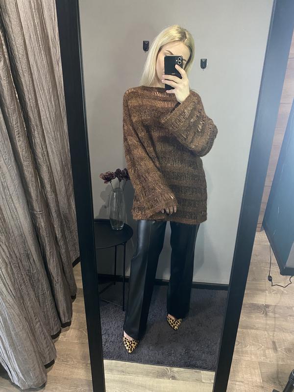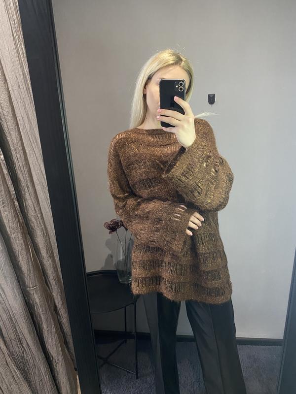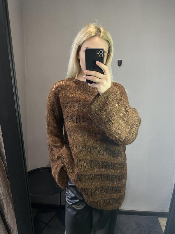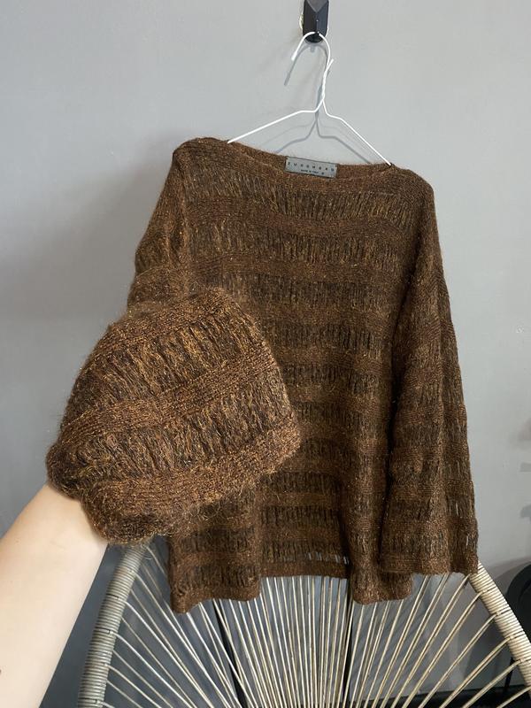 Роскошный свитер-паутинка свободного кроя. Производство - Италия. В составе - шерсть. Цвет - коричневый с легким золотистым блеском. Удлиненный, имеет широкие рукава. Мягкий, к телу приятный.