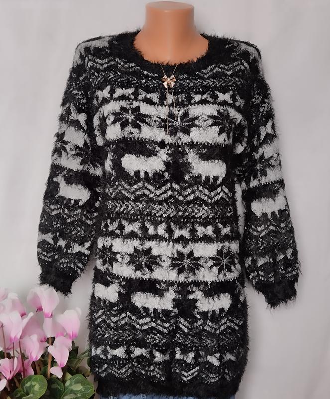 Классный удлиненный свитер туника. Пряжа травка, принт новогодний. Мягкая, пушистая. Состояние в целом хорошее, но есть немного зацепок. Скорее всего, будет на небольшой рост, потому что укороткий рукав, обратитесь внимания на замеры: длина 72 рукав от горловины 61 пог 49-63 пост 47-61 низ 36-54