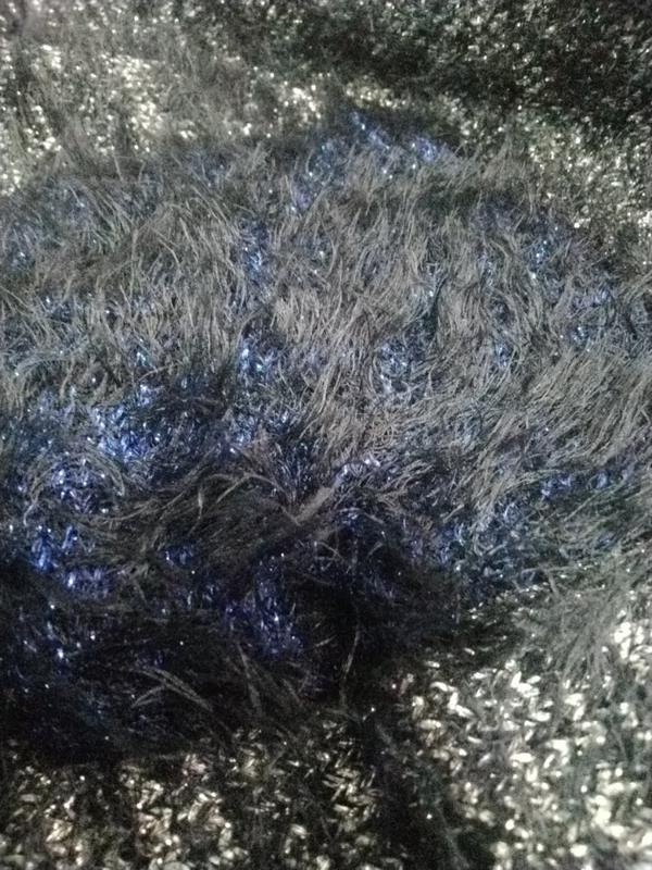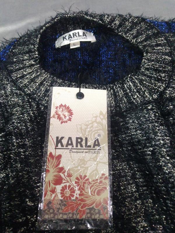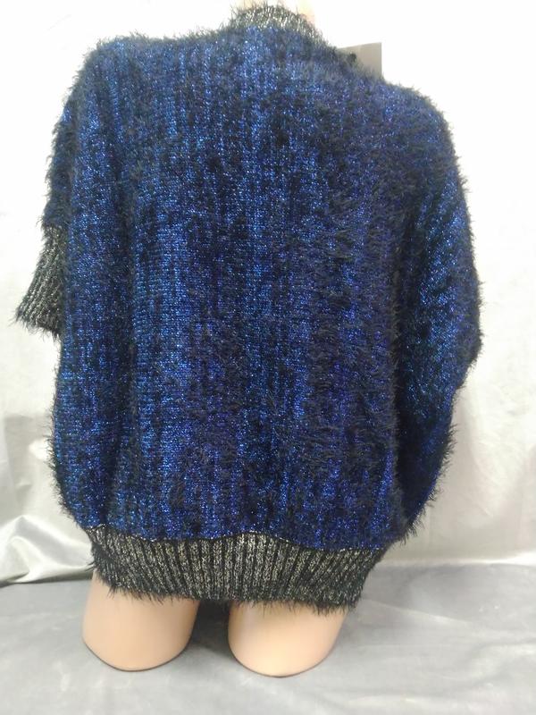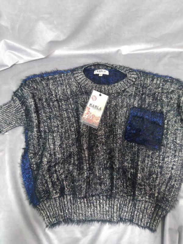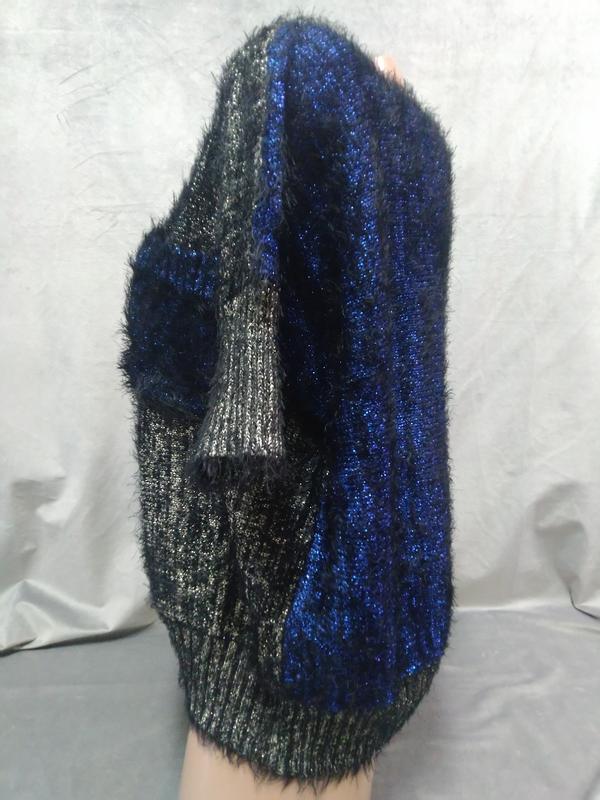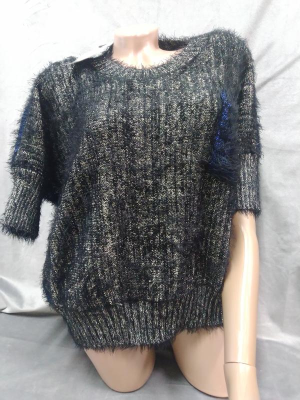 Свитер с коротким рукавом, р.L, Karla. Пушистый, приятный свитерик с люриксовой нитью двух цветов: золото и ярко-синий.Ширина плеча от горловины с манжетом 38см, ширина по груди 74-76см, ширина по низу 49-64см, длина по спинке 53см