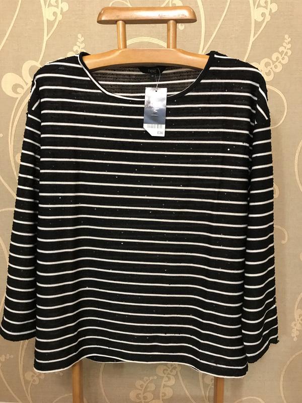 Предлагаю вашему вниманию очень красивую и стильную брендовую кофточку в полоску, местами декорирована паетками (в живую смотрится гораздо интересней). Фирма NEXT. Размер указан 20. Состав: 15% вискоза и 85% полиестер..ткань очень мягенькая и приятная к телу, хорошо тянется. Новая. ПОГ-63+ещё тянется, длина-68, плечи приспущенные-60, длина рукава-48 (или длина рукава от ворота-66), ширина по низу-60+ ещё тянется. ВНИМАНИЕ!!! При покупке три и более моих вещей-бесплатная доставка посылки Новой почтой. Удачных покупок:)