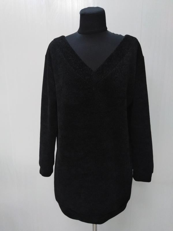 Свитер с велюровый нитки чёрного цвета с люрексом. Свитер прямого кроя, рукава и низ собраны на манжет.Деколье: V образный вырез. Размер: 44-46Ог: 94-98смДлина свитера : 78смДлина рукава : 56см