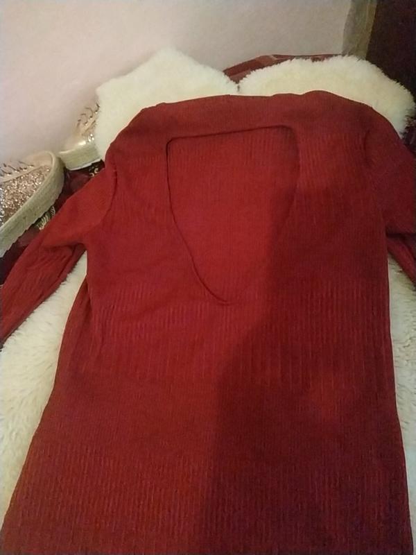 очень красивый гольф с вырезом на спинке в рубчик.Ткань хорошо тянется и красиво смотрится.Размер с,м.описаниесостояние отличноедлина 55рукав 61ширина груди 41