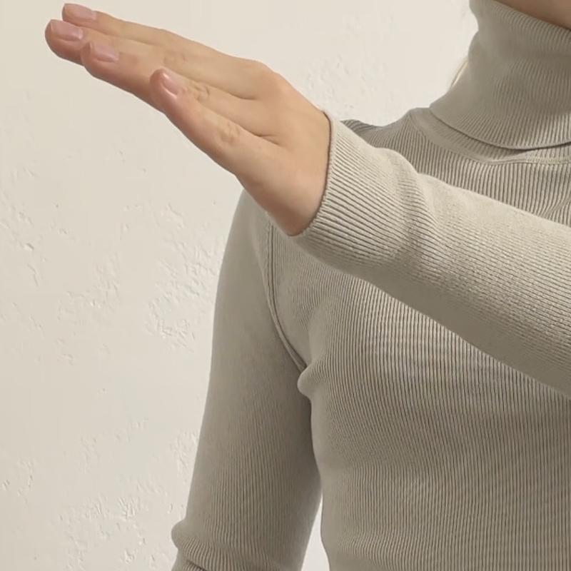 Базовый серый гольфик в рубчик под горло, который можно опустить и поднять выше. Ткань отлично тянется, при этом рукава и низ прилегают плотно.