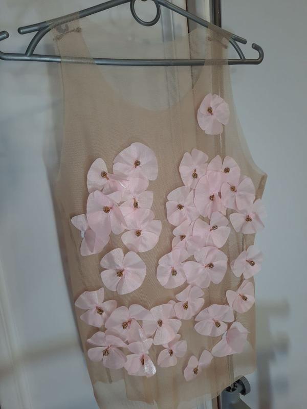 Конструкция: прозрачный топ из стретч-сетки с не глубоким вырезом горловины с переди и сзади, без рукавов, с переди декорирован вручную цветами из органзы и бисера.
