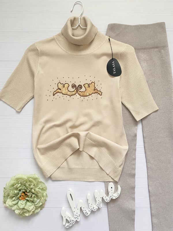 Гольфик с коротким рукавом Вышивка бисер и пайеткиСостав шерсть 60%, Мягкий и приятный, ткань тянется Размер МЗамерыПог 46+Плечи 37Рукав 26Длина 55
