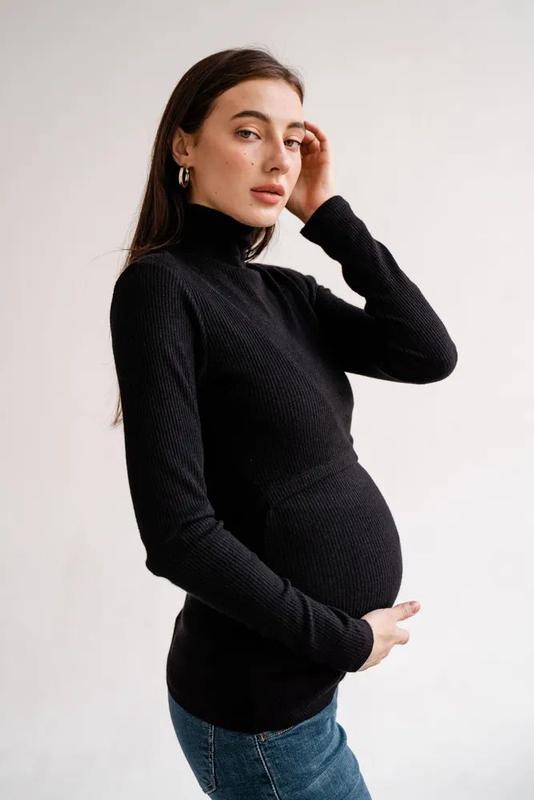 Трикотажний гольфик з сумішевої віскози органічно впишеться в комфортний повсякденний цибулю. Модель облягаючого крою підкреслює достоїнства фігури майбутньої мами. Присутній секрет для годування. Дана модель буде актуальна і після народження малюка. Колір Чорний Склад: віскоза 95%, еластан 5% Довжина виробу по спинке64 см Розмір:42,44,46,48,50,52