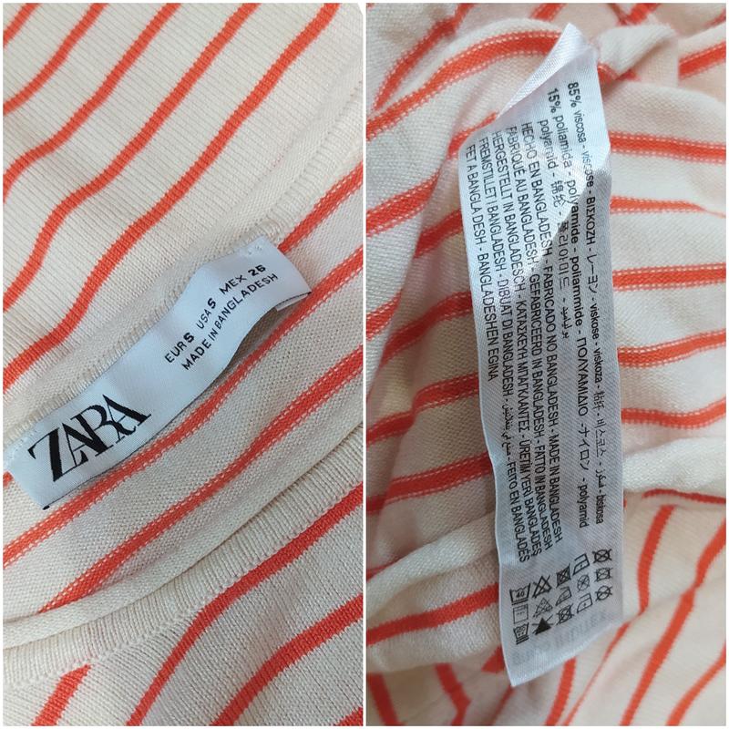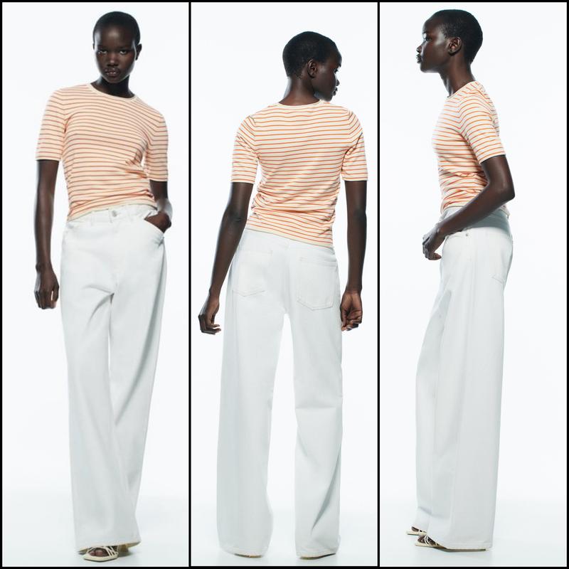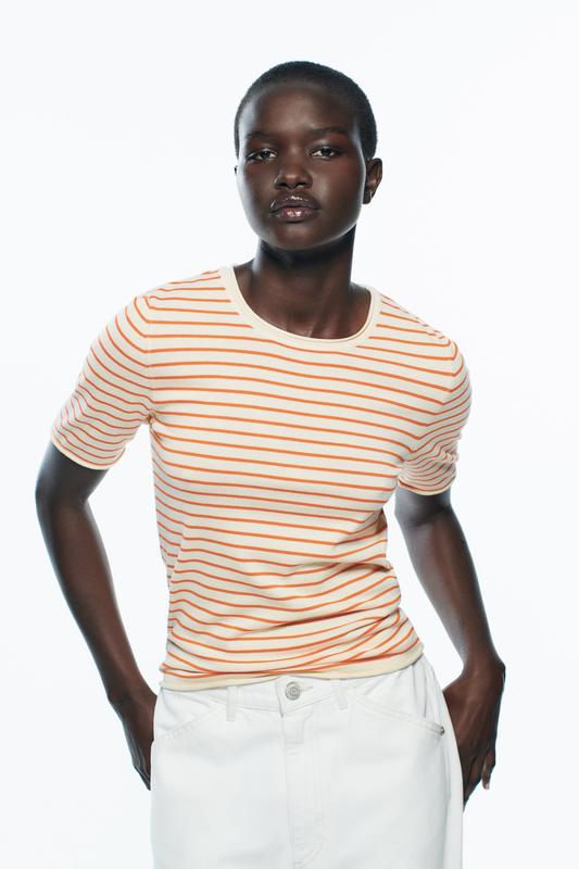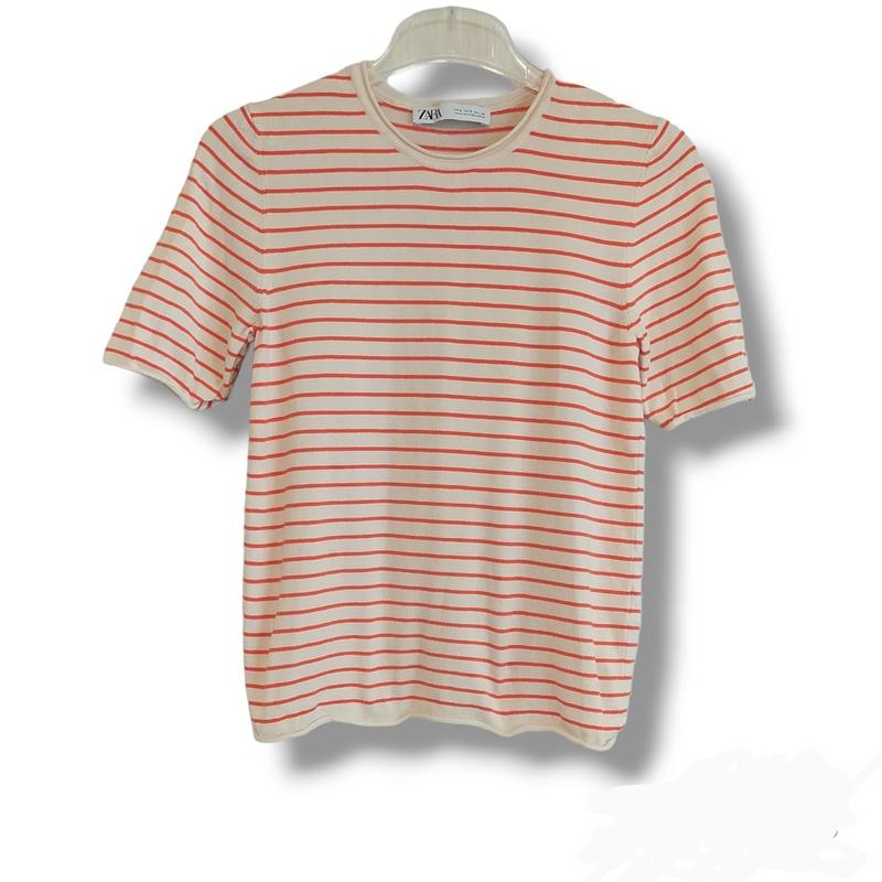 Трикотажная футболка из вискозы Zara. Размер S. В идеальном состоянии. Цвет кремовый/оранжевый.пог 39длина 53ширина в плечах 33плечо 10рукав 25(0205)