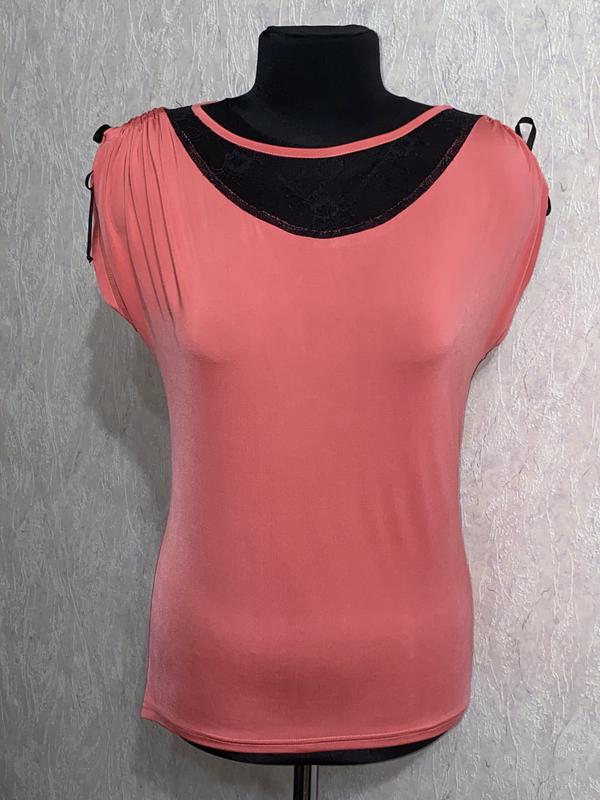 Гарненька футболка коралового відтінку від Андре Тана! Особливості дизайнерської речі: мереживні вставки; на плечиках зав‘язки; крій спинки подовжений.