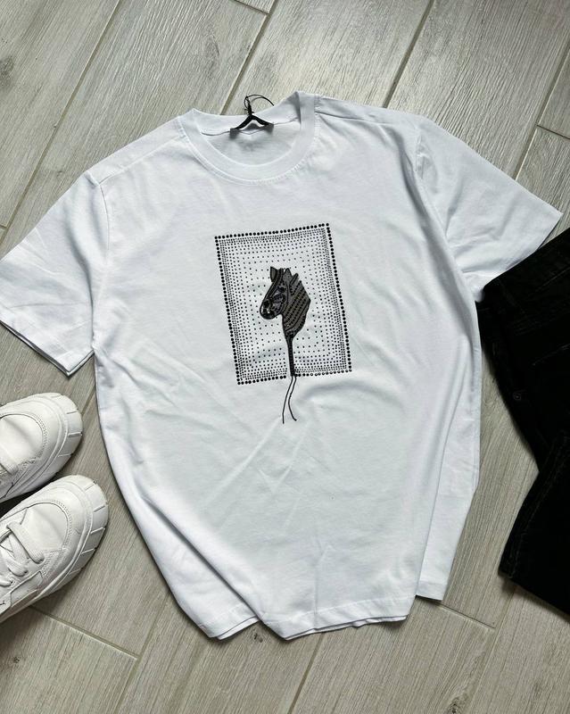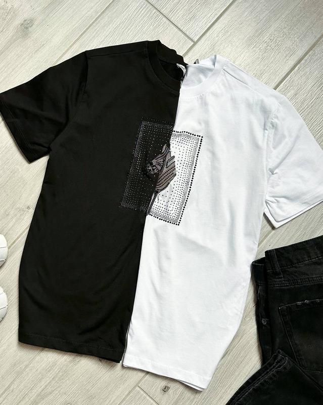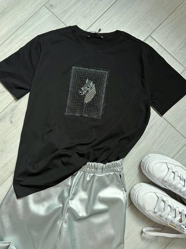 Стильна футболка з вишуканим малюнком з камінців та стразів, дуже гарно і якісно зроблена Виробник Туреччина 🇹🇷 Кольор чорний та білий Зебра заміри:SНОГ-51Довжина -63МНОГ-53Довжина -64LНОГ-55довжина -65