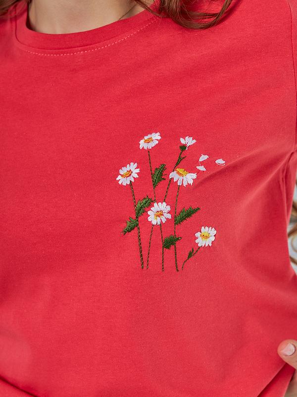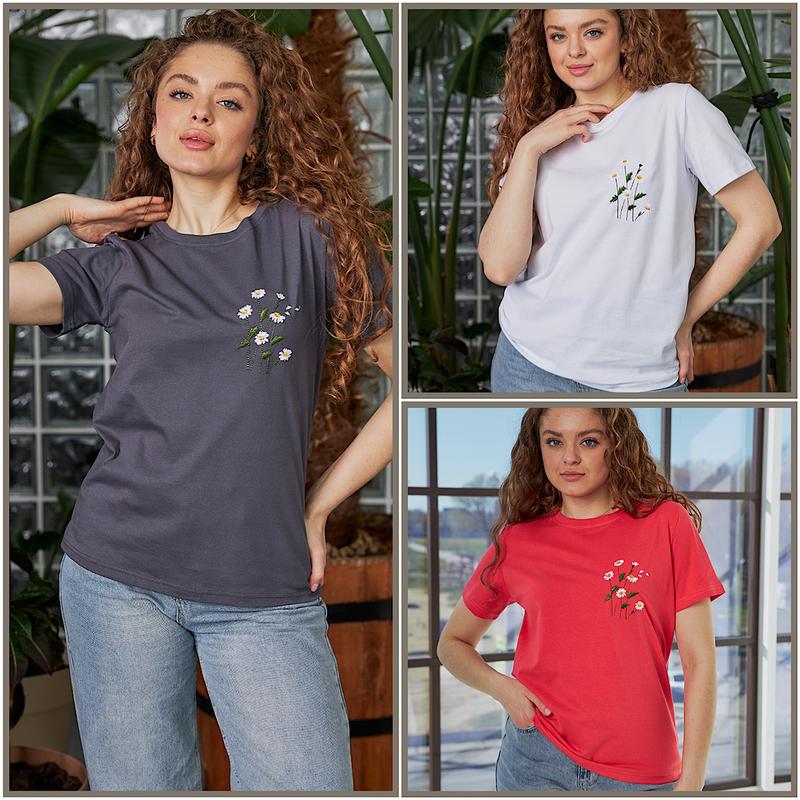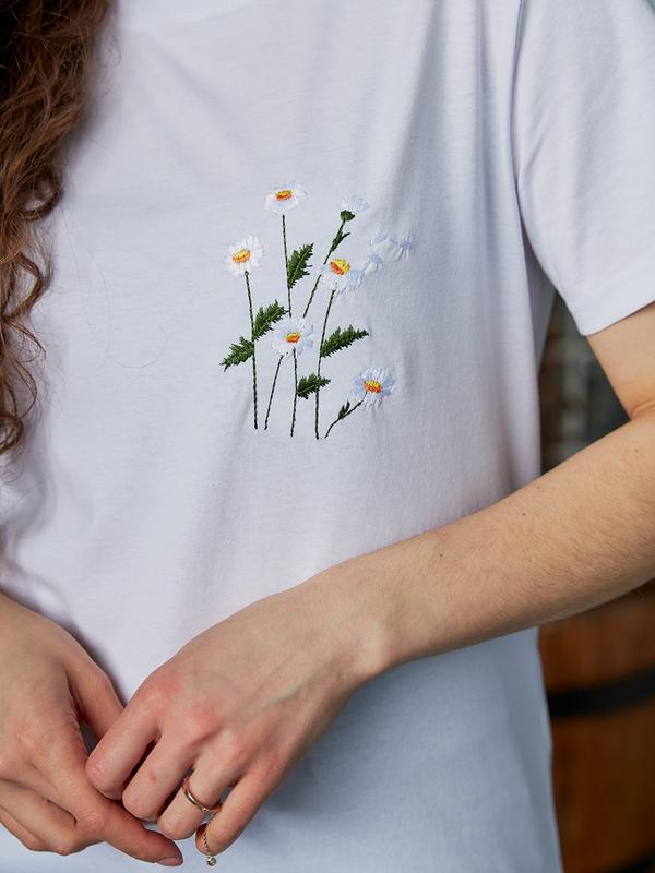 Качественные, оригинальные футболки с вышитыми ромашками. Материалы супрем (100% хлопок)Длина рукава S - 19 см, M -19 см, L - 19 смДлина изделия S - 61 см, M - 62 см, L - 63 смШирина под проймами S - 47 см, M - 49см, L - 51 см