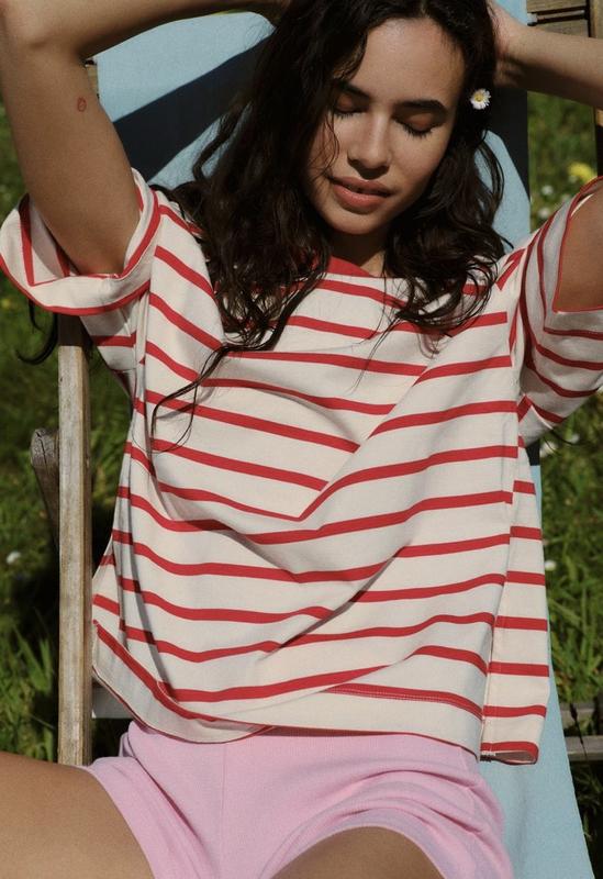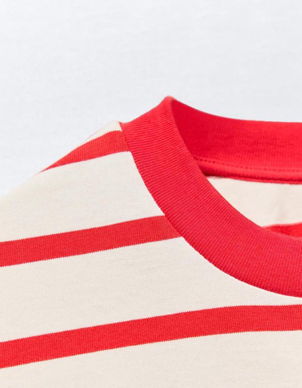 Футболка оверсайз с круглым воротником в рубчик, опущенными проймами и короткими рукавами. Боковые разрезы внизу.