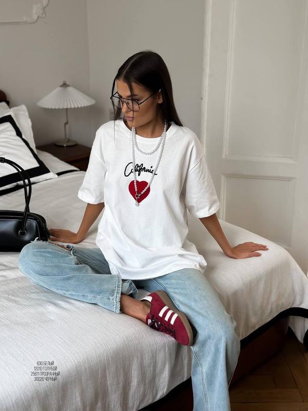 # 844 ▪️Цвет: белый 🥰 ▪️Ткань: Турецкий кулир (Cotton 90% ) ▪Размеры: 42-46 (единственный) Футболка оверсайз с накаткой Сердечко 👑 Легкая приятная к телу ткань не парит 📸 Любимая футболка в вашем гардеробе 👠 Качественная накатка ❤️