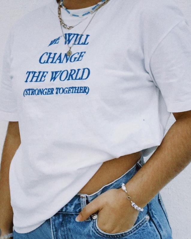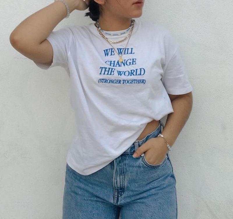 Белая футболка bershka с короткими синими рукавами l топ с надписью l майка укороченная оверсайз