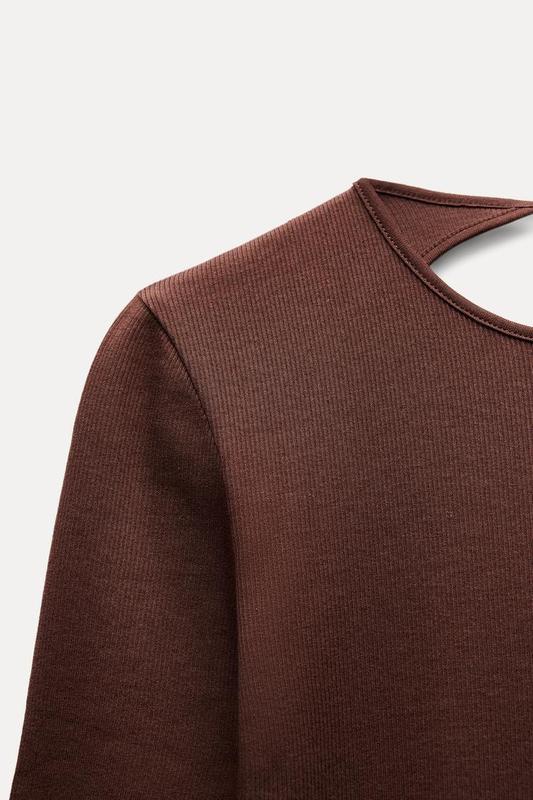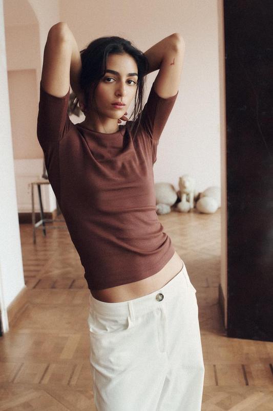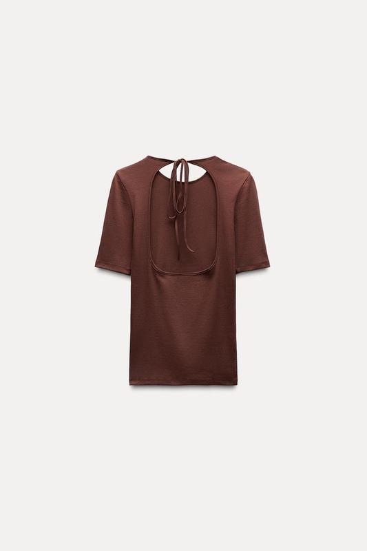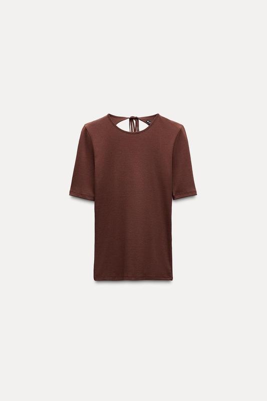 Футболка с круглым вырезом и короткими рукавами. Вырез с шнурками для регулировки спины и ребристой тканью.