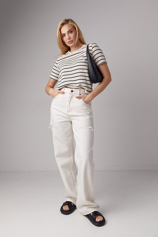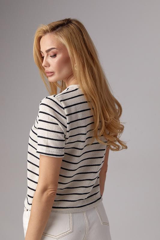 С такой укороченной вязаной футболкой ты можешь сочетать и трикотажные стильные юбки разных фасонов, и летние шорты, и любимые джинсы. Ее трендовый фасон подарит тебе комфорт, а узор в горизонтальную цветную полоску станет основным акцентом каждого образа.