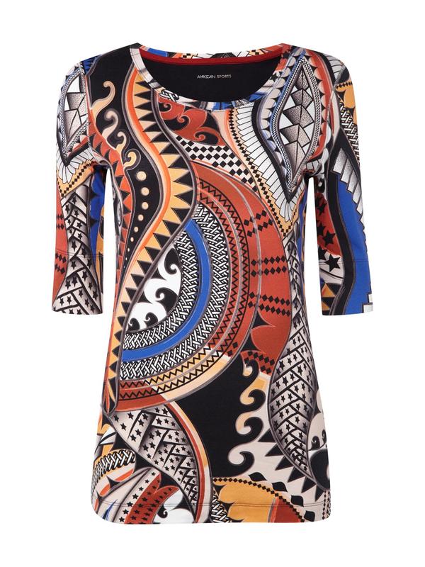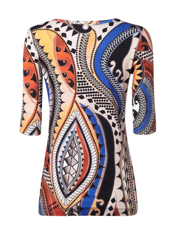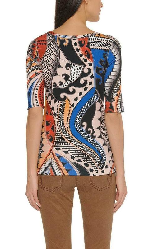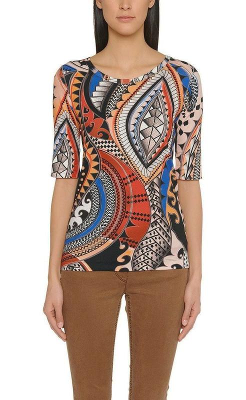 Футболка новая в идеальном состоянии, но без картонной бирки. Трикотаж тонкий (130 грамм), очень эластичный, пружинистый, с ярким экзотическим узором. Облегающий силуэт, рукав 1/2 с широким подворотом, боковые швы обработаны декоративным оверлоком.