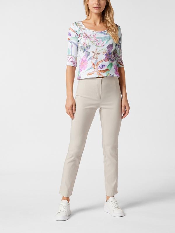 Женская трикотажная рубашка в рубчик Marc Cain Широка кругла горловина Полурукава с манжетами Орхидея принт Прилегающий крой Материал: 94% хлопок, 6% эластан Размер;" XS" Длина: 58 см Пог:40 см Рукав:33 см Стан - идеальный