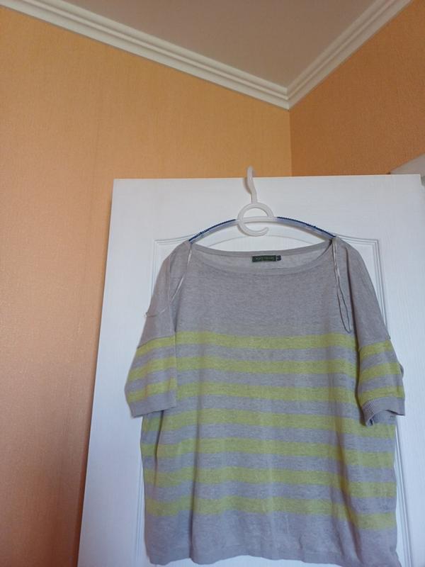 цвет красивый насыщенный светло-светло-серый с желто-лимонным. принт современный актуальный горизонтальная Полоска. Обратите внимание на самые трендовые чечетаниэ цветов желтый и серый. состав 100% трикотажный лен. Попробуйте такой вид льна.Будете в восторге от комфорта. мягкий легкий невесомый.модель ровная расслабленная.размер 10 бренд премиум класса. замеры длина рукава от ворота 36 см.pog 68 см. длина 59 см. модель оверсайз. состояние идеальное. очень рекомендованию