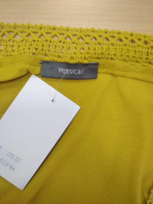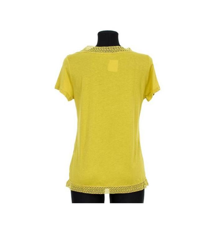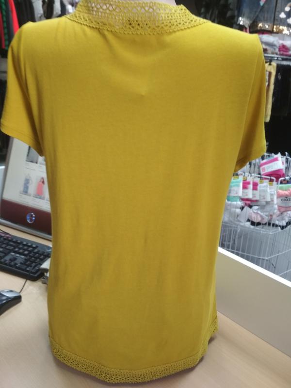 При самовывозе скидка 5%.https://deval.kiev.ua/Код товара 8166/8167.Яркая летняя футболка горчичного цвета. Горловина и низ изделия украшены кружевными вязаными вставками из натурального хлопка.