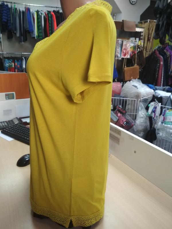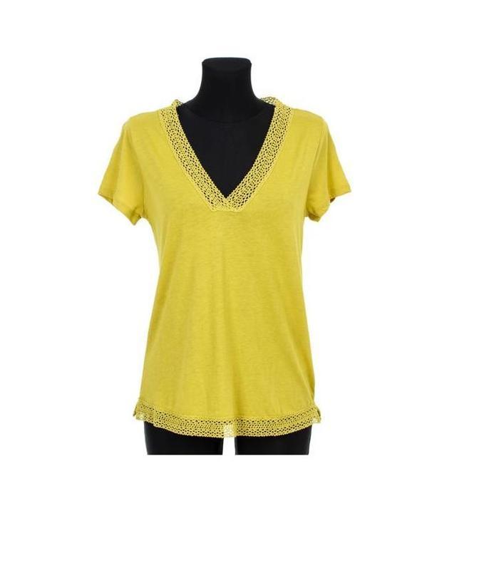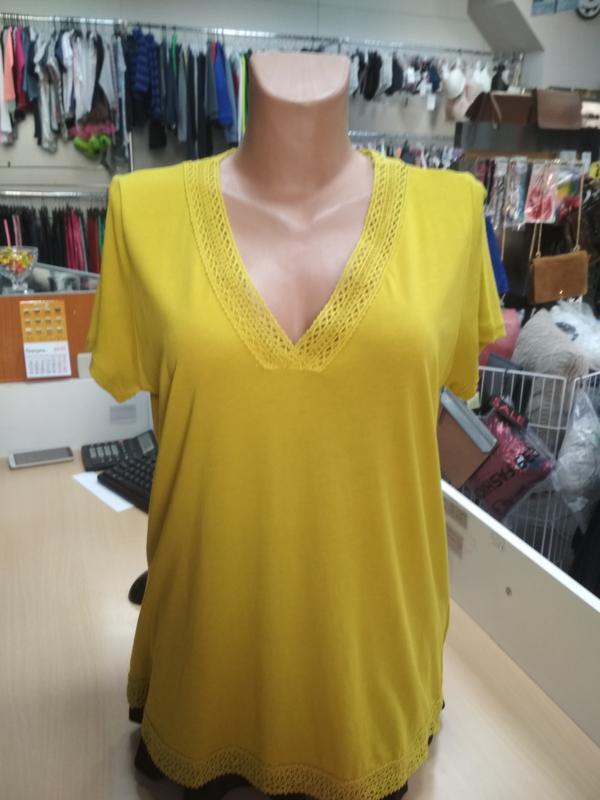 Яркая летняя футболка горчичного цвета. Горловина и низ изделия украшены кружевными вязаными вставками из натурального хлопка.