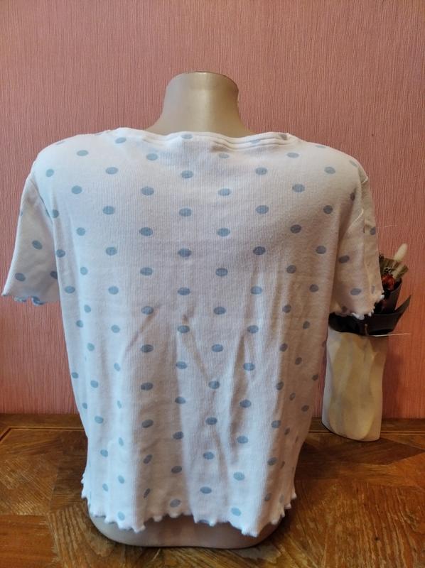 Футболка в горошек свободного крояТкань очень качественная и хорошо тянетсяМатериал вискоза с хлопкомРукава и низ с оборкамиПодойдёт на размер S-XLСостояние идеальноеПо всем дополнительным вопросам обращайтесь в любое время
