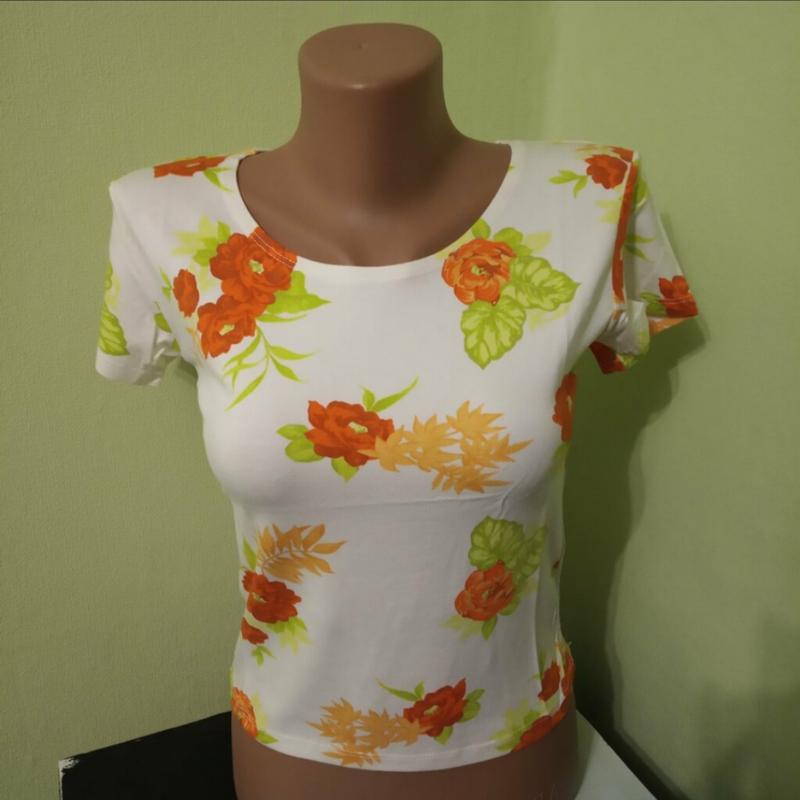 Женский короткий топ кофточка. Футболка с коротким рукавом. Расцветка белая с яркими оранжевыми цветами. Смотрите другие мои объявления. Очень большой выбор футболок и маек маленького размера.