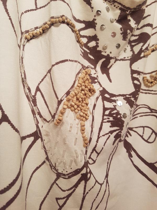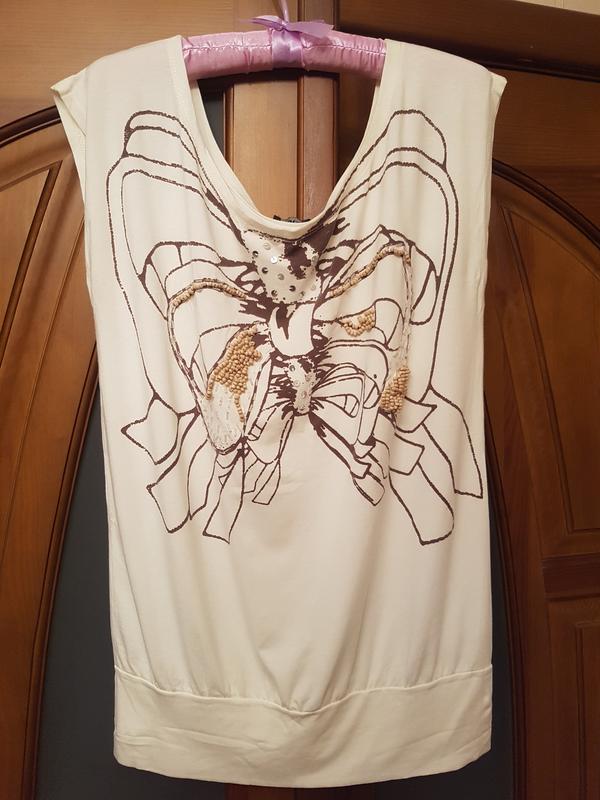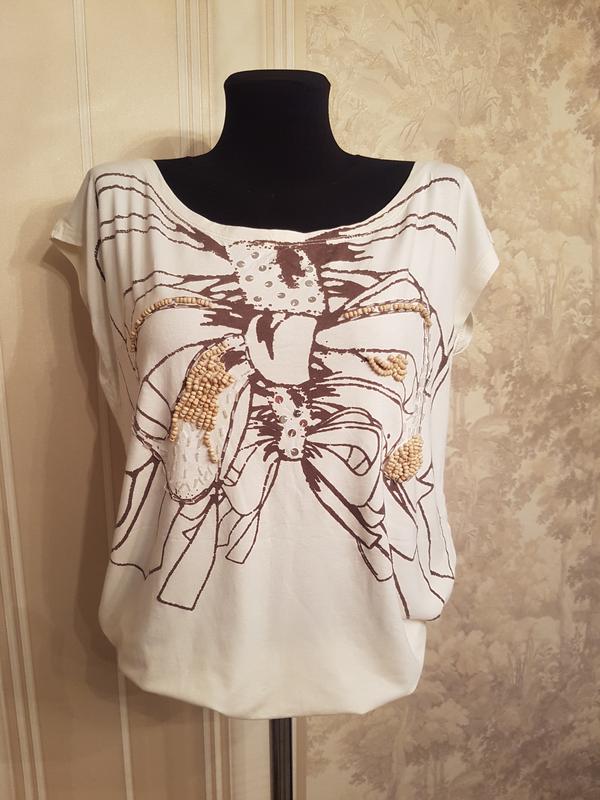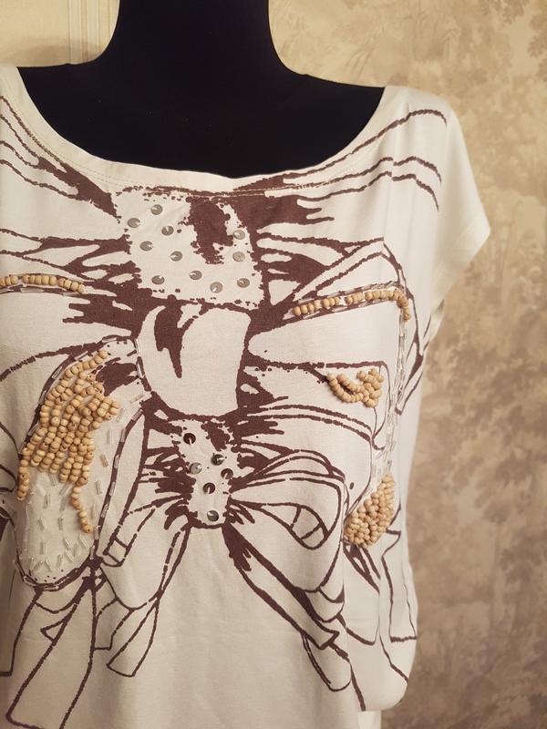 Красивая, нарядная, удобная, лёгкая футболка с принтом "банты" с пейетками, бисером и бусинами из дерева- всё на месте!!! Цвет ближе к айвори.