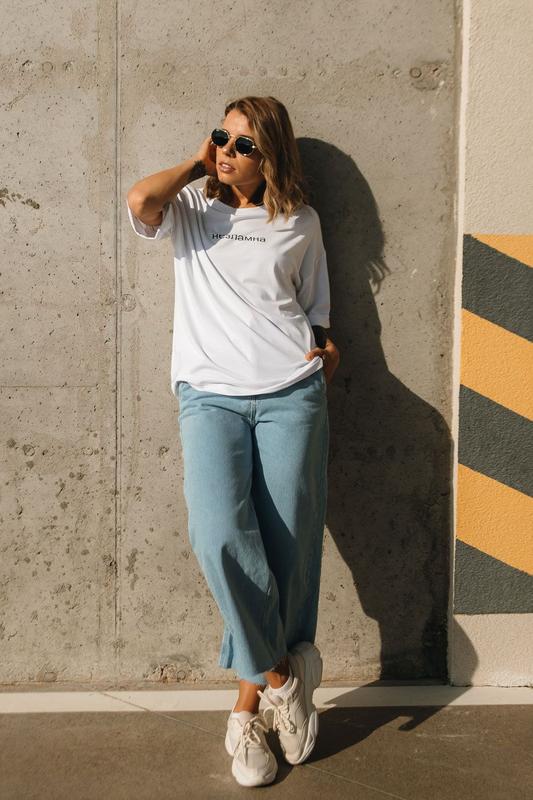 Стильна футболка вільного крою дуже зручна та ідеально доповнить літній образ. Виконана із легкої приємної тканини. Родзинкою моделі є напис "незламна".