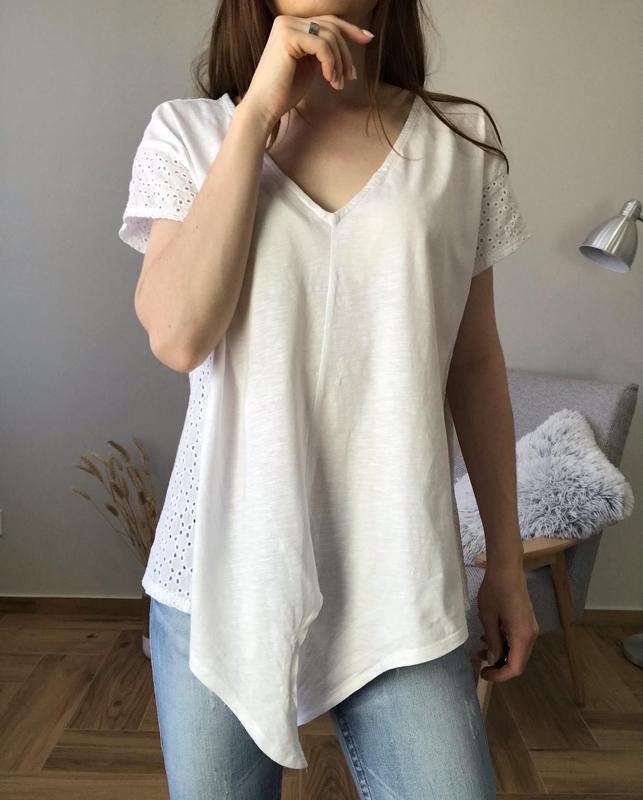 Легенька, білосніжна футболочка PAPAYA • з боків гарне оформлення як мереживо 😍 • спереду завязується • Розмір (14) М/L • 100% бавовна Довжина 57, плечі 48 (до мережива)