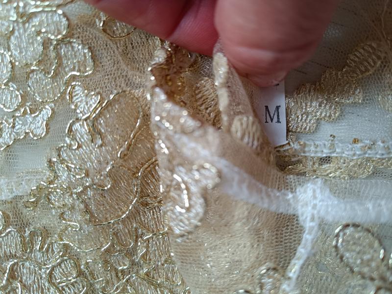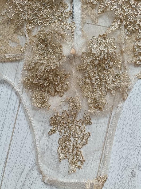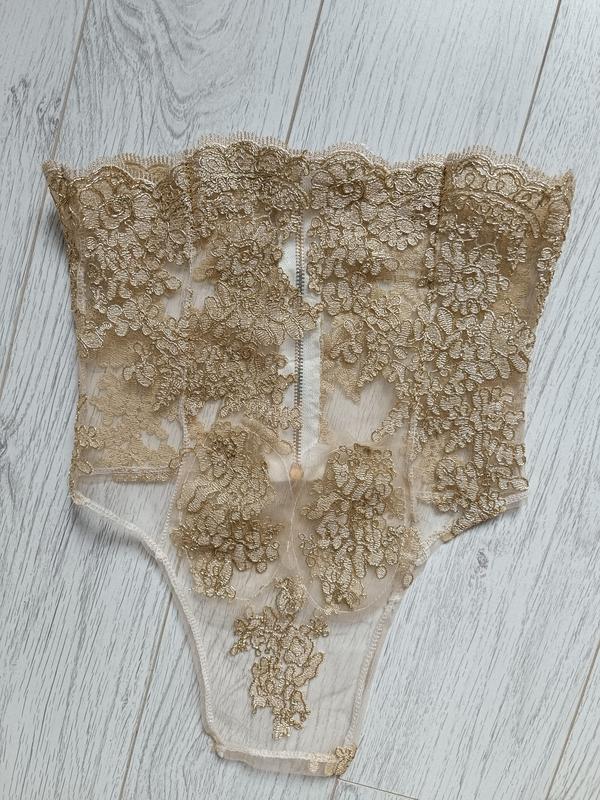 Топ із мережива золотистого кольору розшитого на білій сітчастій тканині, ззаду на металевій блискавці, прозорий без кісточок, спереду подовжена полочка, розмір М, виміри: