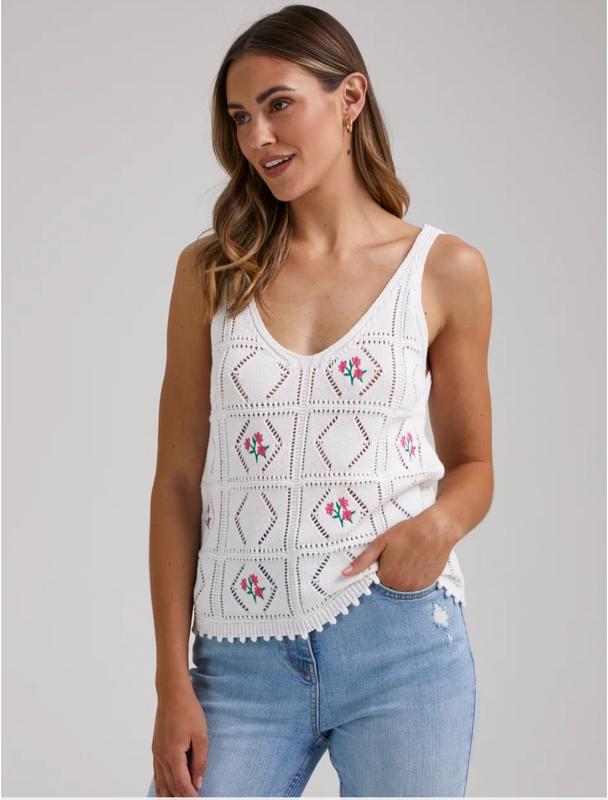 Невероятно нежная майка топ вязаная из натурального хлопка украшена красивой вышивкой цветов. Имеет комфортный свободный крой, широкие бретели и приятную к телу фактуру. Стильно смотрится как в повседневных, так и в более женственных образах. Идеально подойдет для размера L-XL или oversize на M. Замеры: Длина от плеча - 66.5 см Полуобъем подмышками - 49 см Полуширина по низу - 49 см Ширина бретели - 4 см