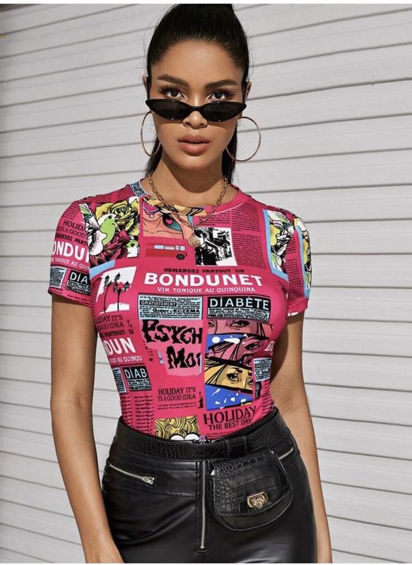 Разовое боди с надписями комиксы стильное боди топ фуксия футболка майка фуксия водолазка...