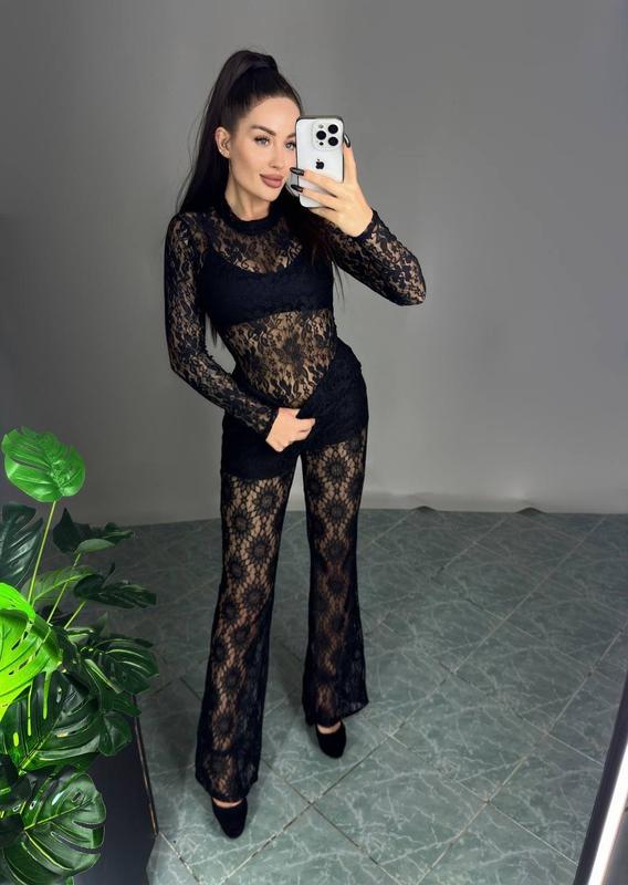 Епатажний гіпюровий боді прозорий облягаючий з довгими рукавами