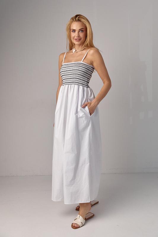 Модный сарафан идет на тонких бретелях без регулировки длины и вверху собран